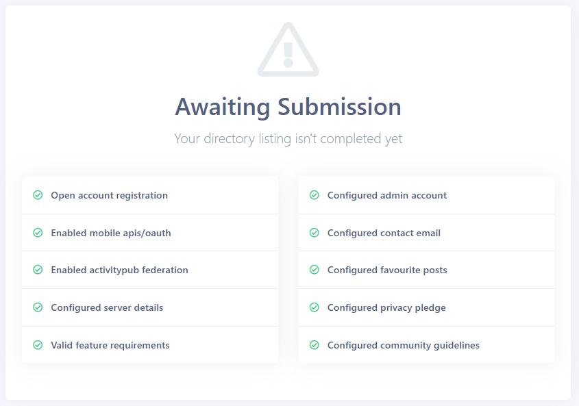 Pour avoir une chance que votre instance soit listée dans la liste officielle du site pixelfed.org, vous devez d’abord remplir les prérequis mentionnés dans votre interface d’administration > Directory.